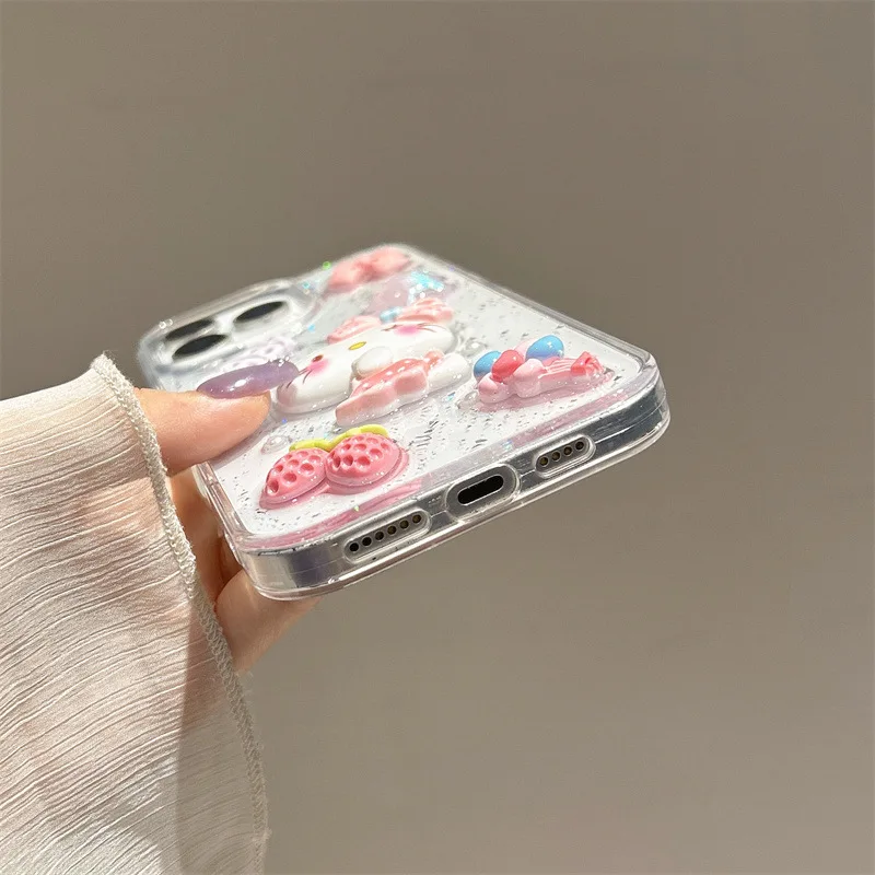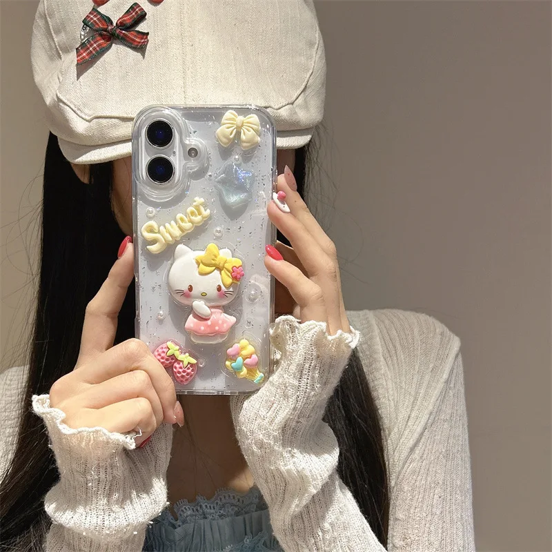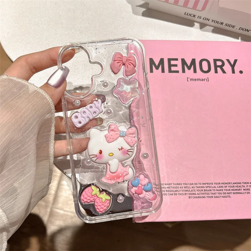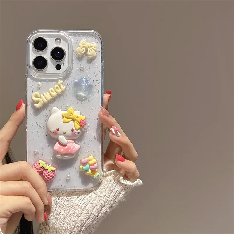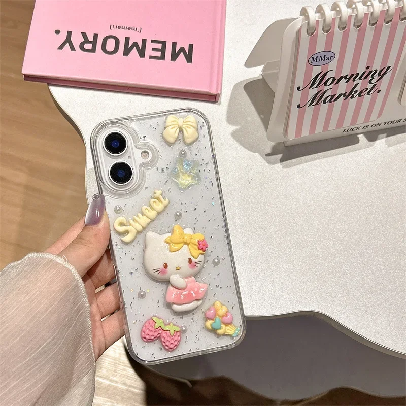 3D Cartoon Strawberry Hello Kitty Drop Glue Glitter Phone Case For iPhone 17Air 16 15 14 13 Pro Max Shockproof Protective Cover