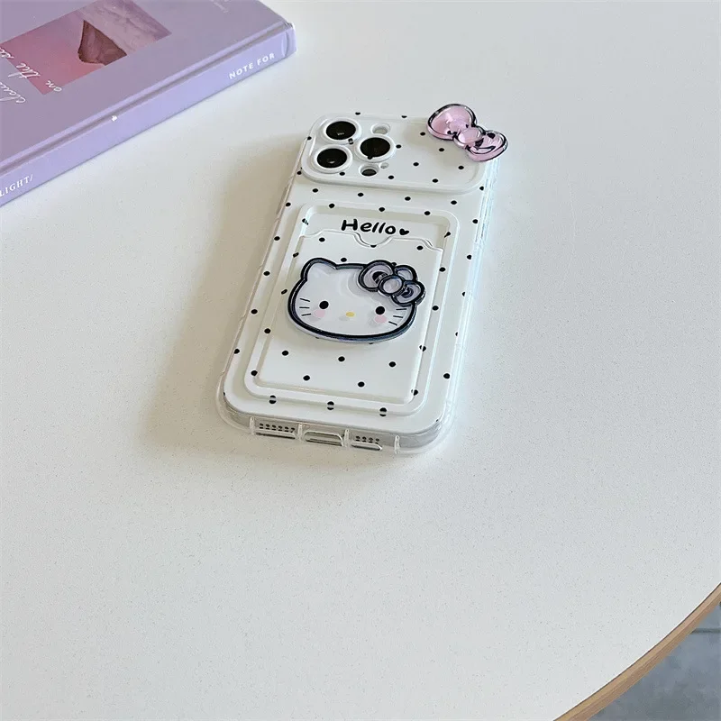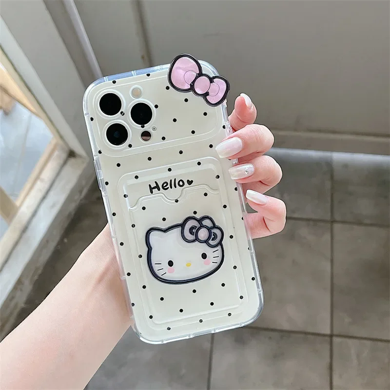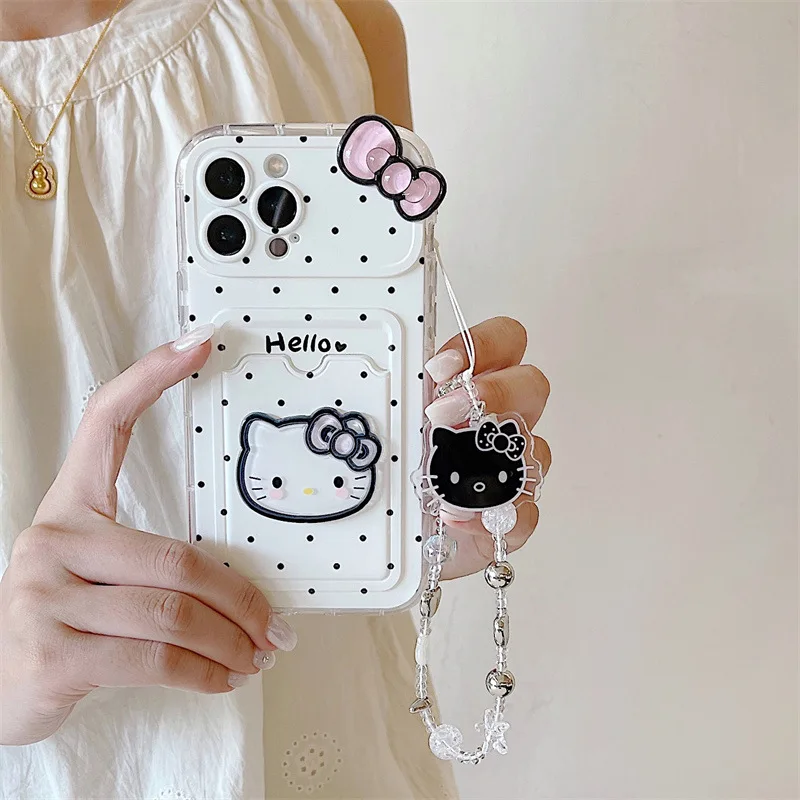 Kawaii Polka Dot Hello Kitty Bowknot Card Slot Bag Holder Phone Case For iPhone 13 15 16 14 Pro Max With Chain Anti-drop Cover